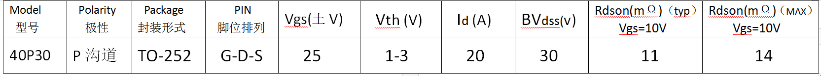 為了解決電子工程師在設計電源的時候能提高過流保護的功能,飛虹電子研發了型號為40P03的MOS管,采用P溝道溝槽工藝,封裝形式為TO-252,腳位排列是G-D-S,mos管廠家其他參數請看下圖: