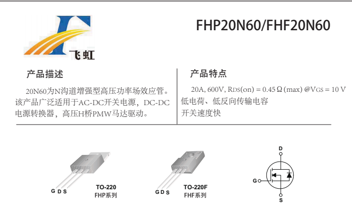它作為一款N溝道增強型高壓功率場效應管,以其20A、600V的參數特點,飛虹電子工程師建議是可廣泛適用于AC-DC開關電源,20A低電荷高壓功率場效應管DC-DC 電源轉換器,高壓H橋PMW馬達驅動。