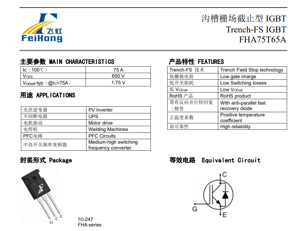 目前飛虹半導體的FHA75T65A型號IGBT產品參數特點為: