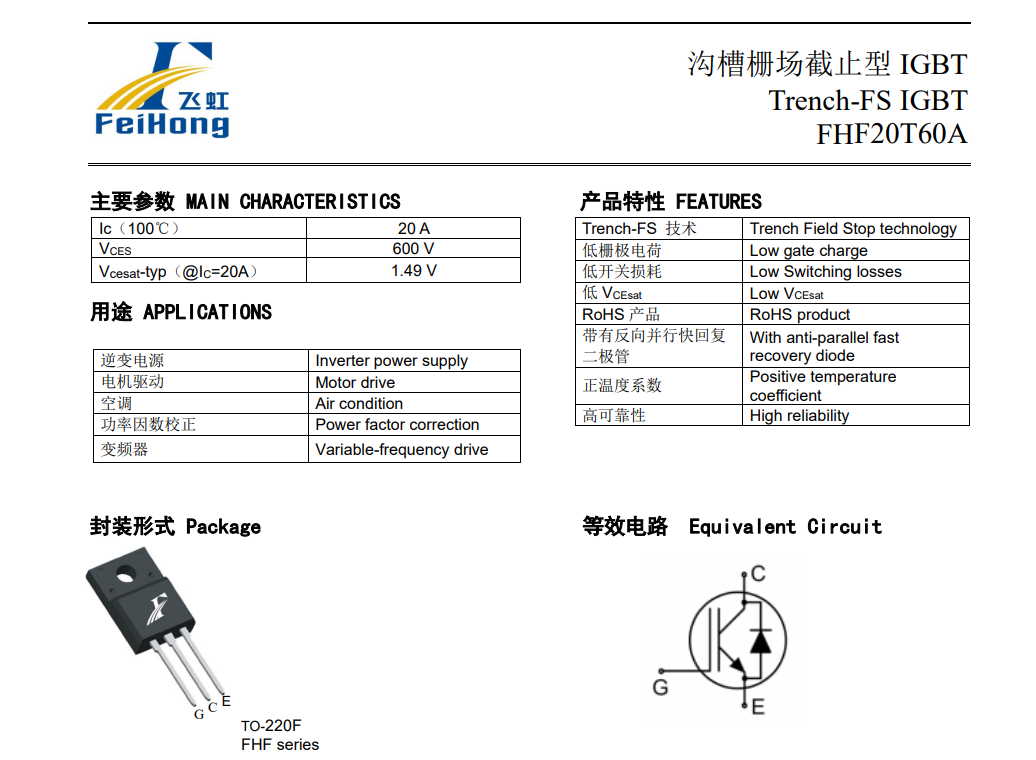 目前飛虹半導體的FHF20T60A型號IGBT產品參數特點為: